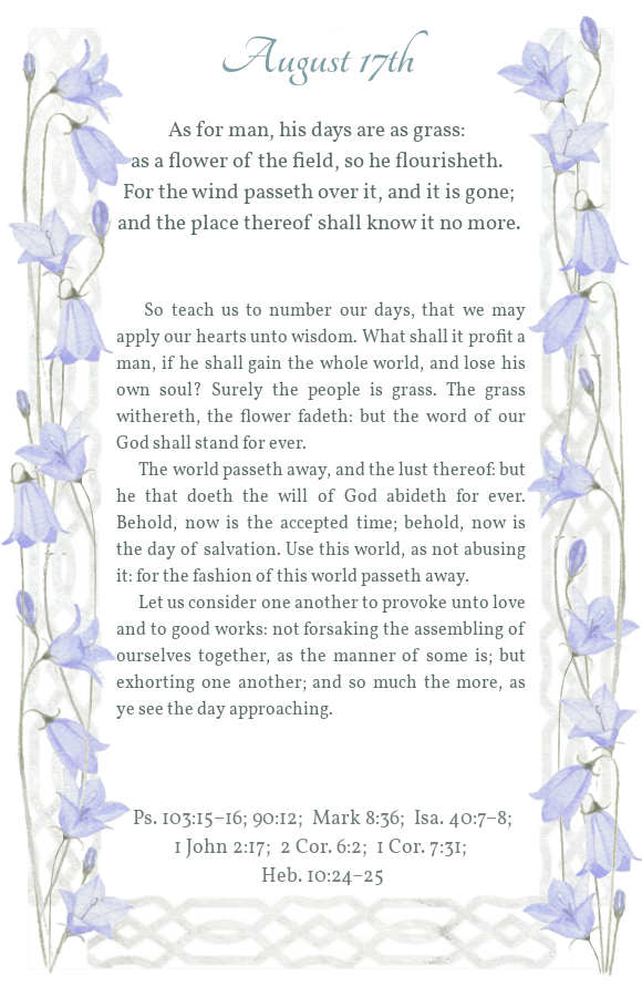 Daily Light August 17th Morning Reading Evening Reading Share this: Share on X (Opens in new window) X Share on Facebook (Opens in new window) Facebook Share on Pinterest (Opens in new window) Pinterest Like Loading...