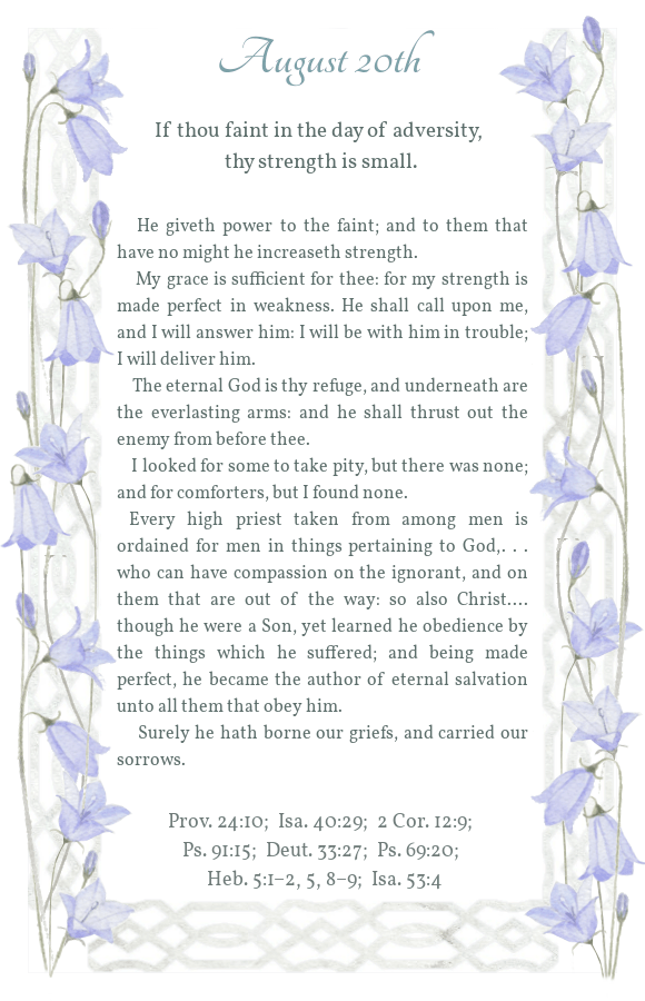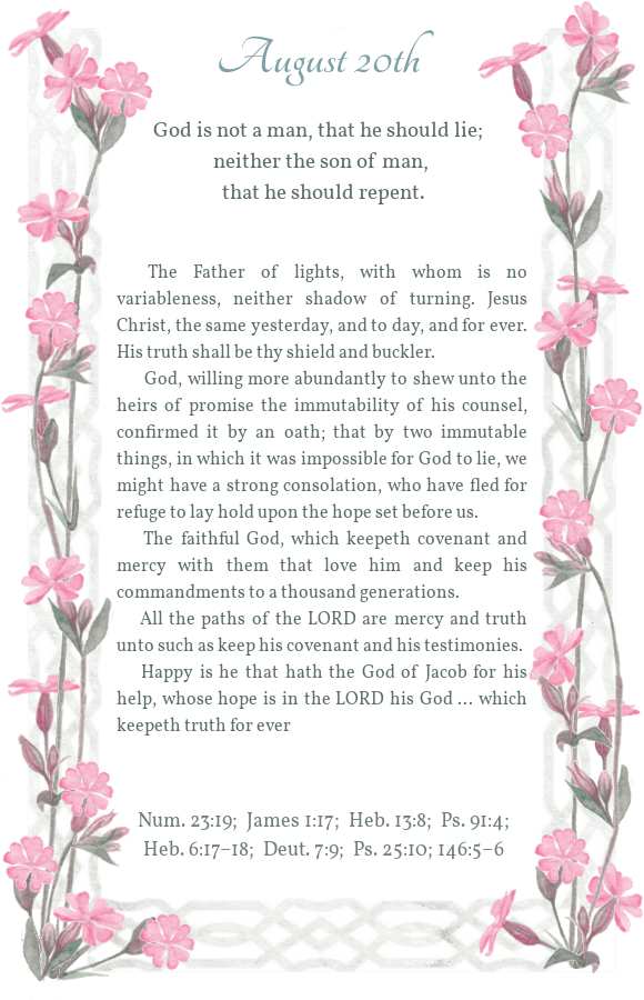 Daily Light August 20th Morning Reading Evening Reading Share this: Click to share on X (Opens in new window) X Click to share on Facebook (Opens in new window) Facebook Click to share on Pinterest (Opens in new window) Pinterest Like Loading...