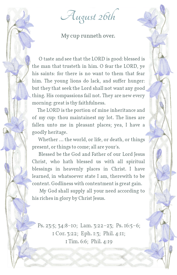 Daily Light August 26th Morning Reading Evening Reading Share this: Share on X (Opens in new window) X Share on Facebook (Opens in new window) Facebook Share on Pinterest (Opens in new window) Pinterest Like Loading...