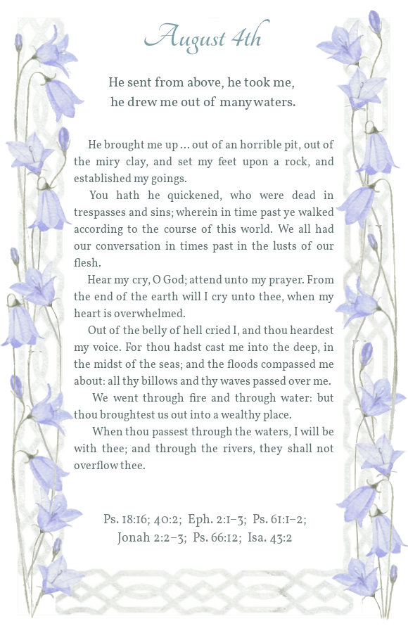 Daily Light August 4th Morning Reading Evening Reading Share this: Click to share on X (Opens in new window) X Click to share on Facebook (Opens in new window) Facebook Click to share on Pinterest (Opens in new window) Pinterest Like Loading...