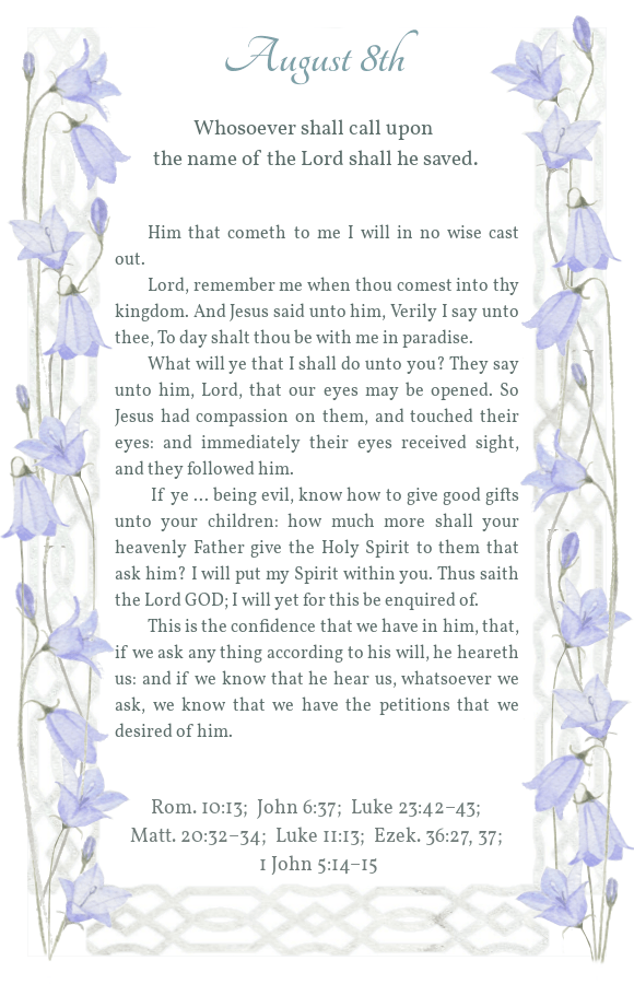 Daily Light August 8th Morning Reading Evening Reading Share this: Click to share on X (Opens in new window) X Click to share on Facebook (Opens in new window) Facebook Click to share on Pinterest (Opens in new window) Pinterest Like Loading...