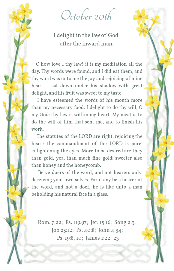 Daily Light October 20th Morning Reading Evening Reading Share this: Click to share on X (Opens in new window) X Click to share on Facebook (Opens in new window) Facebook Click to share on Pinterest (Opens in new window) Pinterest Like Loading...