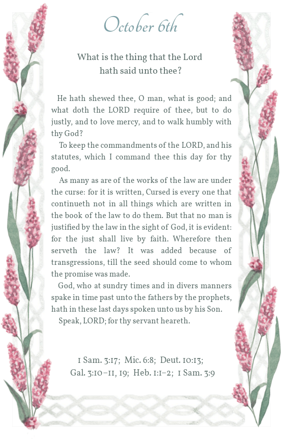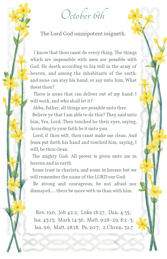 Daily Light October 6th Morning Reading Evening Reading Share this: Share on X (Opens in new window) X Share on Facebook (Opens in new window) Facebook Share on Pinterest (Opens in new window) Pinterest Like Loading...