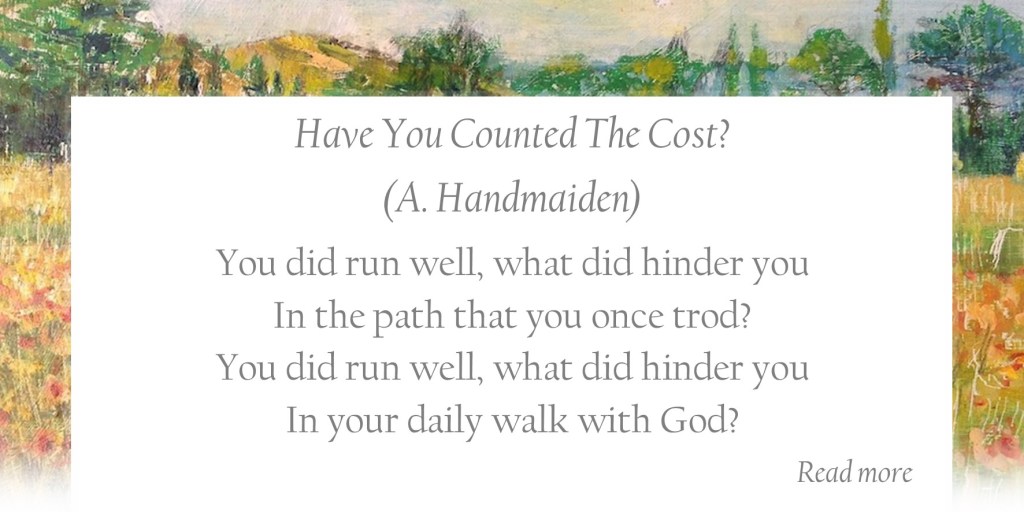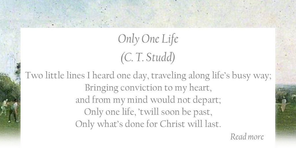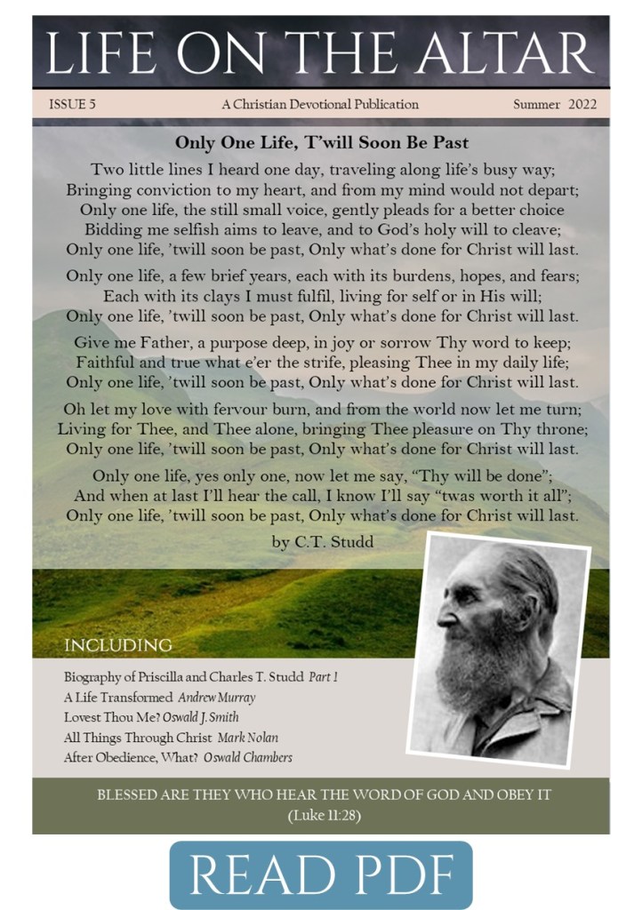 Issue 5 Summer 2022 Called To Obedience “If you love Me, you will obey Me.” (John 14: 15) IN THIS ISSUE ARTICLES Keeping In StepF. B. Meyer A YOKE—for two! All through His earthly life Jesus was saying: take My yoke. What was His yoke? It was surely His desire to do the Father’s will. This was the watchword of His life (John 5:30; John 6:38). So persuasive was His appeal, that the sons of Zebedee left their father and boat; Andrew and Simon their fishing-nets; and Matthew his toll-booth to become His disciples….Read more A Life TransformedAndrew Murray I thank God for the story of Peter. I do not know a man in the Bible who gives us greater comfort. When we look at his character, so full of failures, and at what Christ made him by the power of the Holy Ghost, there is hope for every one of us. But remember, before Christ could fill Peter with the Holy Spirit and make a new man of him, he had to go out and weep bitterly; he had to be humbled….Read more We Live unto The LordCharles H. Spurgeon If God had willed it, each one of us might have entered heaven at the moment of conversion. It was not absolutely necessary for our preparation for eternity that we should tarry here, for it is possible for one to be taken to heaven and be found “meet to be a partaker of the inheritance with the saints in light” though he has only just come to know Jesus….Read more After Obedience, what?Oswald Chambers We are apt to imagine that if Jesus Christ constrains us and we obey Him, He will lead us to great success; but He does not. We would have thought these men would have had a most successful time, but their obedience led them into a great disaster….Read more FervencyA. B. Saint The coming of Christ we know is a certainty, and in the light of this understanding revealed to us by the Holy Spirit through the Scriptures, and also by the things which are coming upon the earth, the Believer’s attitude towards Christ should cause us to live and remain in a constant attitude of fervency….Read more The Hill CountryStreams in the Desert There is always room higher up. When the valleys are full of Canaanites, whose iron chariots withstand your progress, get up into the hills, occupy the upper spaces. If you can no longer work for God, pray for those who can. If you cannot move earth by your speech, you may move Heaven….Read more Lovest Thou Me?Oswald J. Smith “LOVEST thou Me?” The question was startling. The little group sitting round the fire on the shore of the Galilean sea, glanced quickly up at the speaker’s face. With expectation gleaming in His eyes, He sat quietly gazing at but one, and waiting for the answer….Read more Delighting to do His WillAmy Carmichael I have often noticed that if anyone, who has been asked to do a difficult thing for the sake of The Lord Jesus, does it and does it heartily, that one seems almost to gain a new power of joy and a wonderful new liberty….Read more The Same DayOswald Chambers “Take now your son . . .”Genesis 22:2 God’s command is, “Take now,” not later. It is incredible how we debate! We know something is right, but we try to find excuses for not doing it immediately. If we are to climb to the height God reveals, it can never be done later- it must be done now. And the sacrifice must be worked through our will before we actually perform it….Read more Zeal, Faith, FervourFrances Ridley Havergal “The king’s business required haste” (1 Samuel 21:8) Yet there is no other business about which average Christians take it so easy. They “must” do all that is expected of them, and then, after this, that and the other thing is done, they will do what they can of the King’s business. Is this being “faithful and loyal and single hearted”?…Read more StraightawayCharles H. Spurgeon “Straightway they forsook their nets, and followed him.”Mark 1:18 When they heard the call of Jesus, Simon and Andrew obeyed at once without demur. If we would always, punctually and with resolute zeal, put in practice what we hear upon the spot, or at the first fit occasion, our attendance at the means of grace, and our reading of good books, could not fail to enrich us spiritually….Read more POETRY BIOGRAPHY PART 1 CHINA The world famous English cricketer C.T. Studd shocked the sporting world and all who knew him when at the age of twenty four he turned his back on his success, reputation, wealth and prominence to become a missionary for Jesus Christ. In February 1885, along with six other Cambridge students, Charles sailed to China with the sole intent of serving God by bringing the gospel to the lost millions who had never heard the name of Jesus. He was as consumed with this purpose as he had been with cricket, exchanging one passion forever for another….Read more All Things Through ChristMark Nolan “Lord, save me and I will serve you the rest of life!” This was my first prayer in many years, said as I faced death through blood loss, and the reality of dying without Christ was suddenly all that mattered….Read more Trusting GodCorrie Ten Boom From the very beginning of my ministry I have felt it was wrong to ask for money, even to ask for travelling expenses. I did not want to be paid for ‘services rendered,’ I simply wanted to preach the Gospel and let The Lord provide for me….Read more BIBLE STUDY Being a Doer of The Word Share this: Click to share on X (Opens in new window) X Click to share on Facebook (Opens in new window) Facebook Click to share on Pinterest (Opens in new window) Pinterest Like Loading...