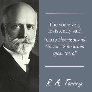 And I worked away on my sermon with my exordium, my firstly, my secondly, my thirdly, my fourthly, my fifthly, and my peroration. But the voice was very insistent, “Go to Thompson and Horton’s saloon and speak there.”