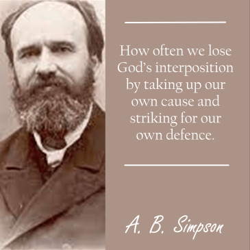 There is another kind of stillness: the stillness that lets God work for us, and we hold our peace; the stillness that ceases from controversy, and self-vindication, and expedients of wisdom and forethought and lets God provide and answer the unkind word, and the cruel blow, in His own unfailing, faithful love. How often we lose God’s interposition by taking up our own cause and striking for our own defence.